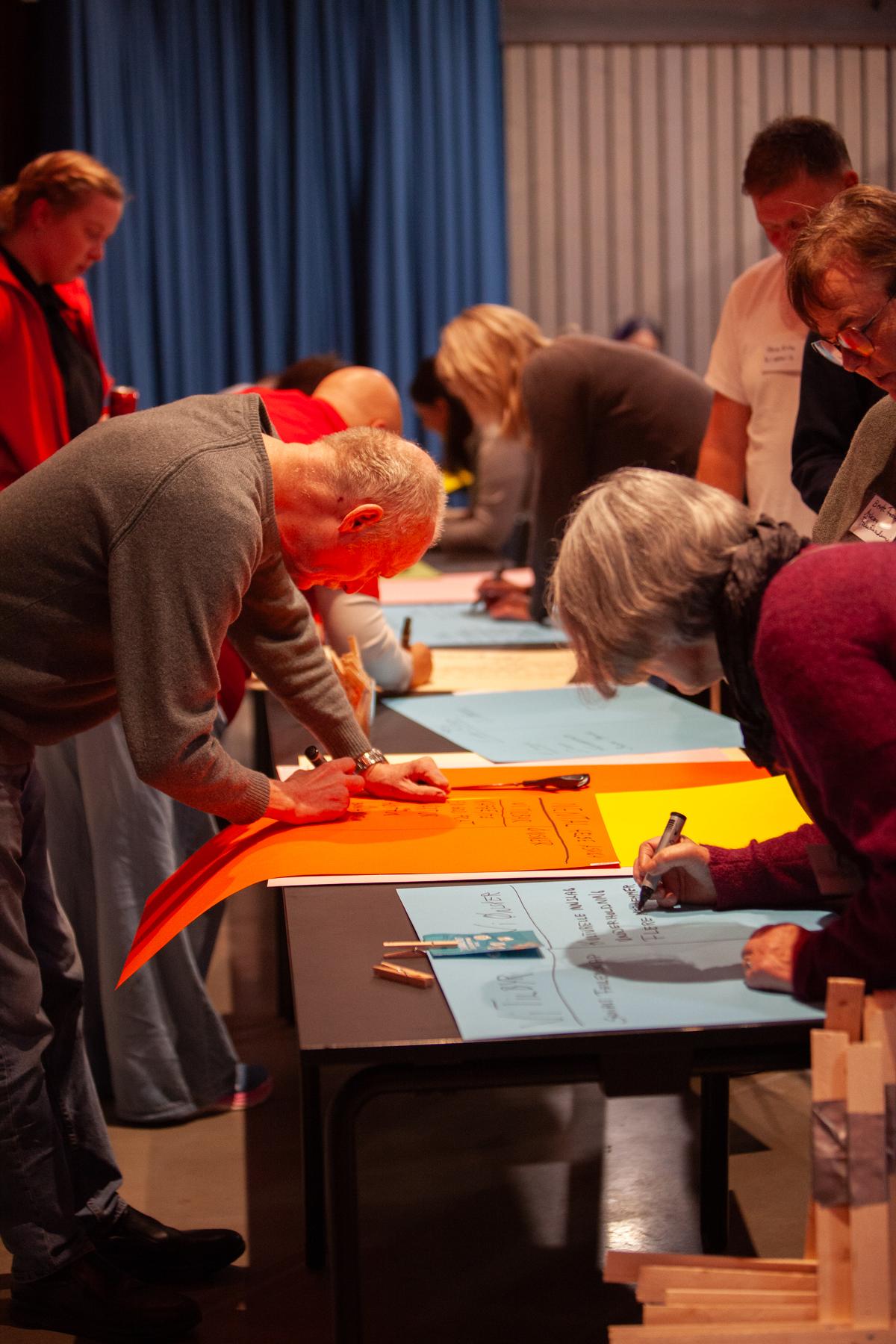 Så var det tid for det gøyeste med børsen; nemlig plakatverksted hvor man skulle skrive på ønsker og hva man kunne tilby. Fargerike plakater på hjemmesnekret plakatstativ begynte å ta form.